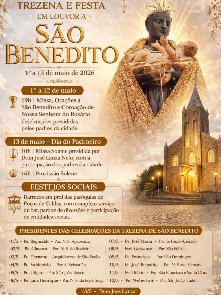 A Paróquia Nossa Senhora Aparecida, situada no bairro Aparecida, divulgou a programação religiosa da Festa de São Benedito, que acontece anualmente em Poços de Caldas sempre no início do mês de maio. A programação terá início no dia 1º de maio, e segue até o dia 13, quando é comemorado o Dia da Festa de São Benedito na cidade. Todas missas e celebrações da programação serão celebradas na Capelinha de São Benedito.